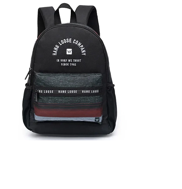 Mochila Hang Loose construído em poliéster 600D, com compartimento para notebook de até 15,5", compartimento principal grande e outro compartimento frontal com fechamento em zíper, além de alça de costas acolchoadas e alça de mão.