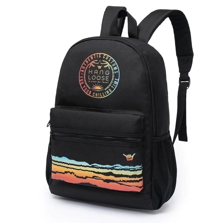 Mochila Hang Loose construído em poliéster 600D, com compartimento para notebook de até 15,5", compartimento principal grande e outro compartimento frontal com fechamento em zíper, além de alça de costas acolchoadas e alça de mão.